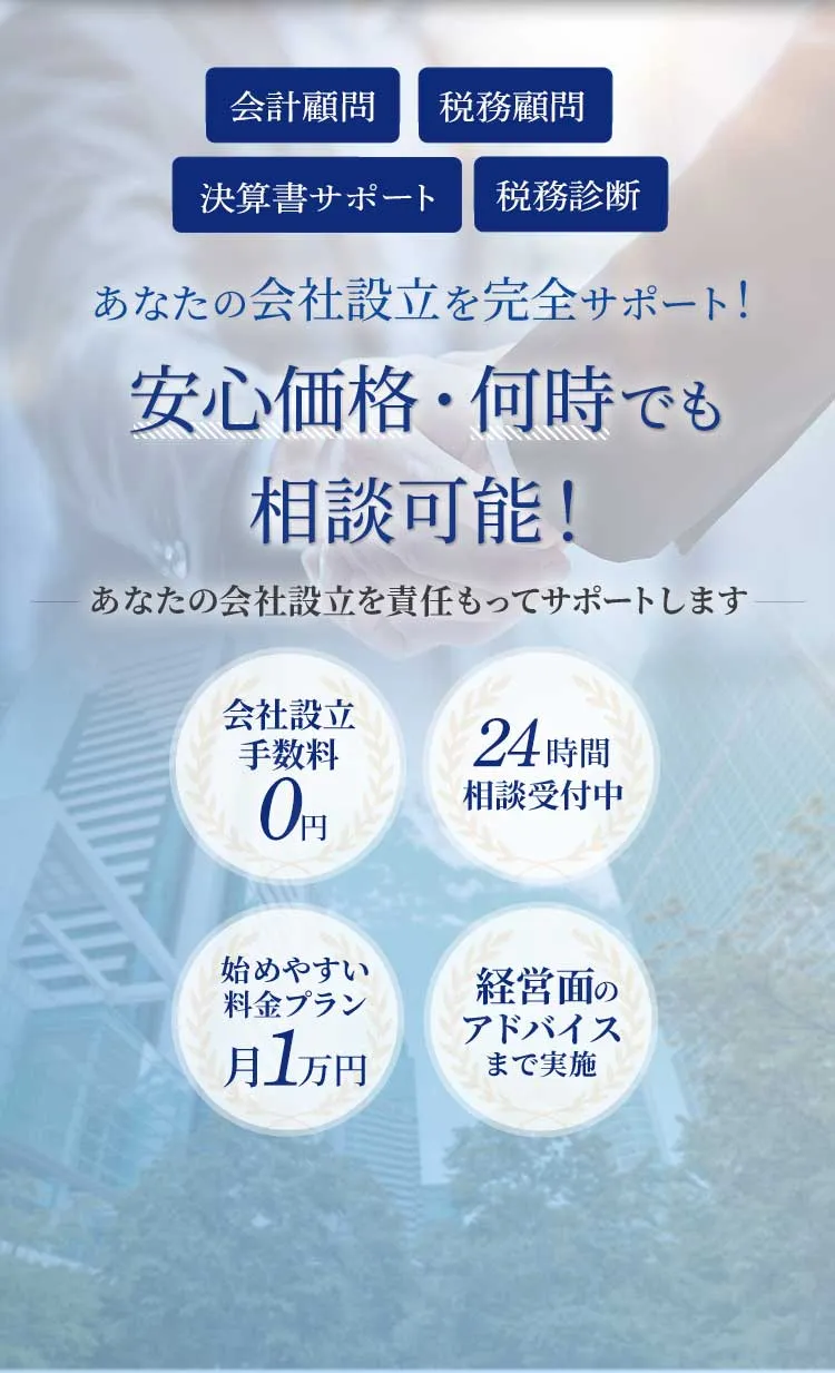 当社の月額の顧問契約には、会社設立のサポート業務も含まれているため、 会社設立手数料は必要ありません。